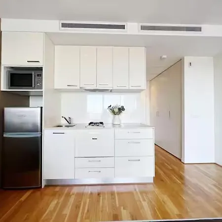 Eine voll ausgestattete Küchenzeile mit einem Wasserkocher und einem Kühlschrank gehört zur Ausstattung der Unterkunft für Selbstversorger. Die Bushaltestelle La Trobe Street liegt in unmittelbarer Nähe von dieser Unterkunft.